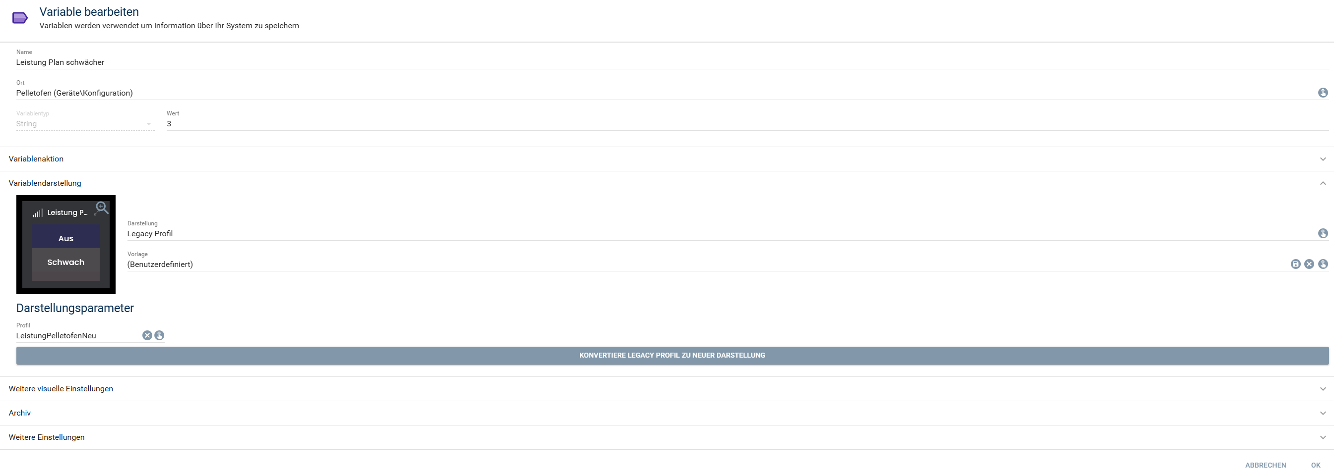 Das “Schalte auf Wert” wurde automatisch geändert wenn ich in die Details der Aktion reinschaue. Ich kann bei Variablen, die eine Darstellung hinterlegt haben, in der Liste der möglichen Aktionen diese eine Aktion (Wert auf von anderer Variable), diese Aktion nicht wählen. Wird mir gar nicht angezeigt. Ändere ich auf Legacy Profil oder wähle eine Variable mit Legacy Profil, dann kann ich die Aktion aus der Liste wählen.