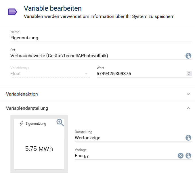 ich habe ein Problem bzw. stehe ggf. auf dem Schlauch. Ich habe mehrere Variablen (geloggt als Zähler) die den Ertrag der Photovoltaikanlage angeben. In Wh (Wattstunden). Diese nutzen die vorgegebene Vorlage “Energy” zur Variablendarstellung. Diese setzt die Angabe in Watt je nach Wert zu kWh oder MWh um. Die Idee dahinter ist super.