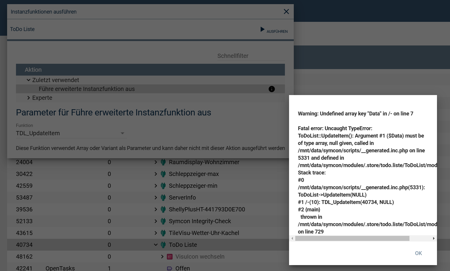 Und wenn ich die Instanzfunktion “TDL_UpdateItem” ausführe erhalte ich folgende Fehlermeldung…