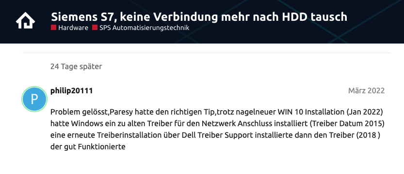 Vielen Dank für Deine Nachforschungen.Die Einstellungen sind korrekt und seit 8 Jahren unverändert.Ich muss nochmals mit unserem Siemens Support reden,aber bei meiner CPU kann ich vermutlich nichts einstellen.Was auffällt ist,dass ich seit dem Umzug zurück auf Windows 11 (17.10.2025 12:28 Uhr)KEINERLEI Abbrüche mehr hatte.Wie ich es von meinem System her kannte.