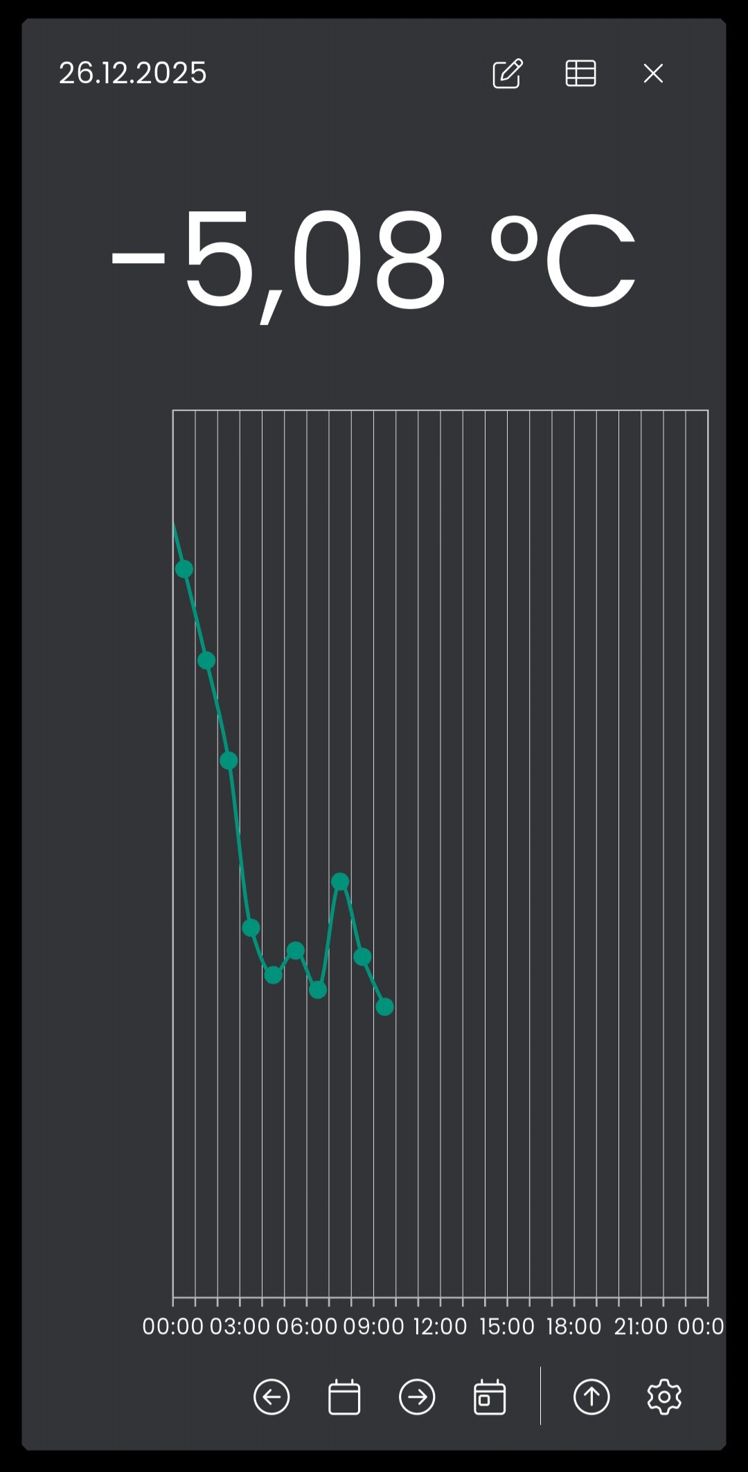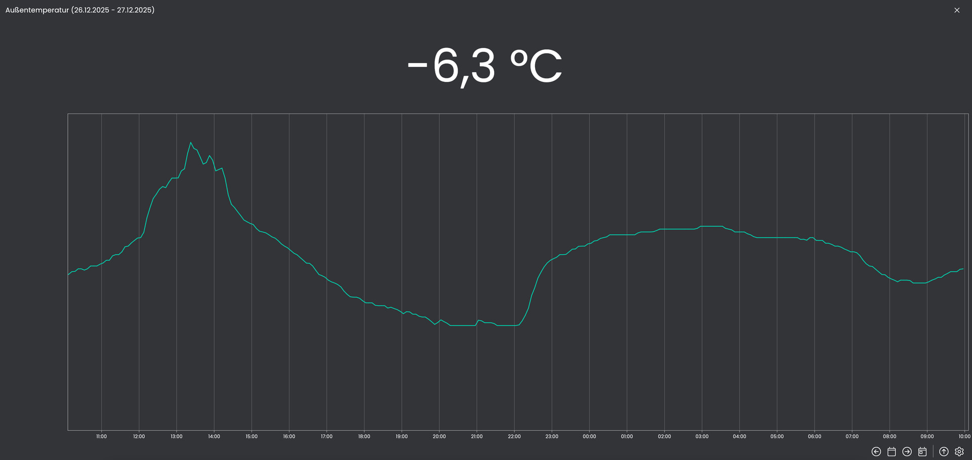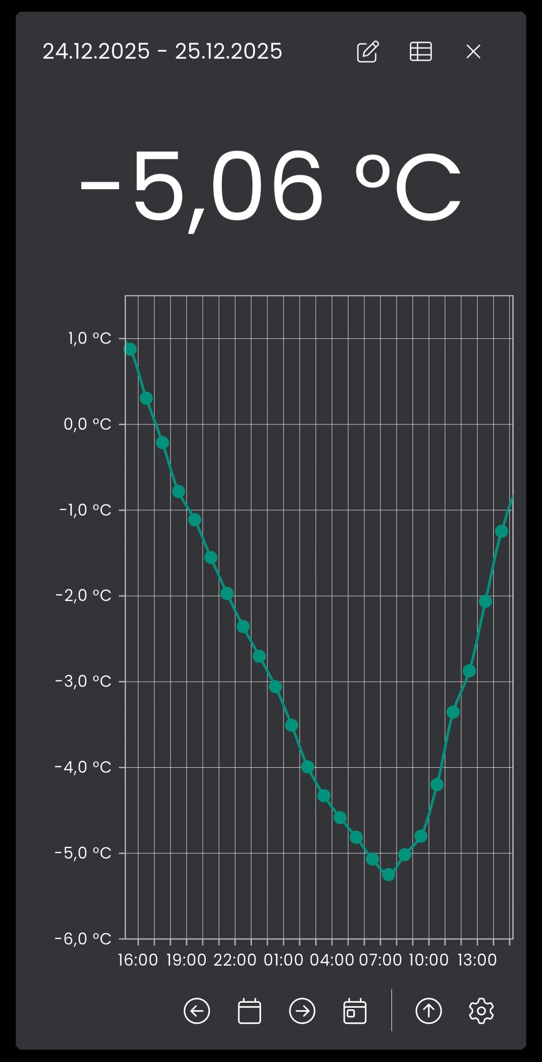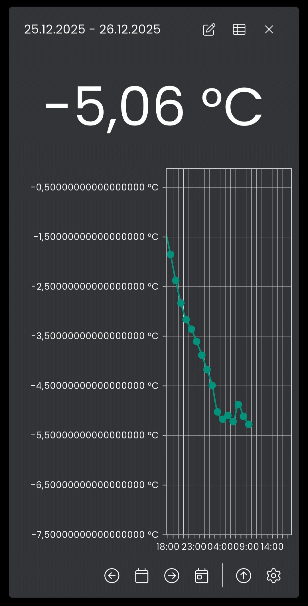 unsere Außentemperatur ist mittlerweile oft unter Null Grad. Nun ist mir in der App ein Darstellungsproblem aufgefallen. Sobald ausschließlich negative Werte dargestellt werden sollen, läuft die linke Achse aus dem Ruder.