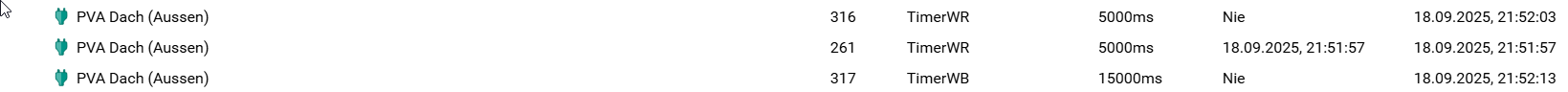 Meist bei einem Modulupdate (nur bei meinem Goodwe Modul mb-stern/Goodwe at development) wird der eine der zwei Timer (immer derselbe) doppelt angelegt. Meist, aber nicht immer. Wenn er dann doppelt angelegt ist wird die Aktualisierung des Moduls blockiert. Dies ca. 15min lang, dann löscht ich der überflüssige Timer von selber und das Modul aktualisiert wieder gemäss Vorgaben. Siehst du oder jemand anderes die Ursache? Mache ich einen Fehler? Ich bin zwar der Meinung, die Timer bei allen Modulen immer gleich anzulegen