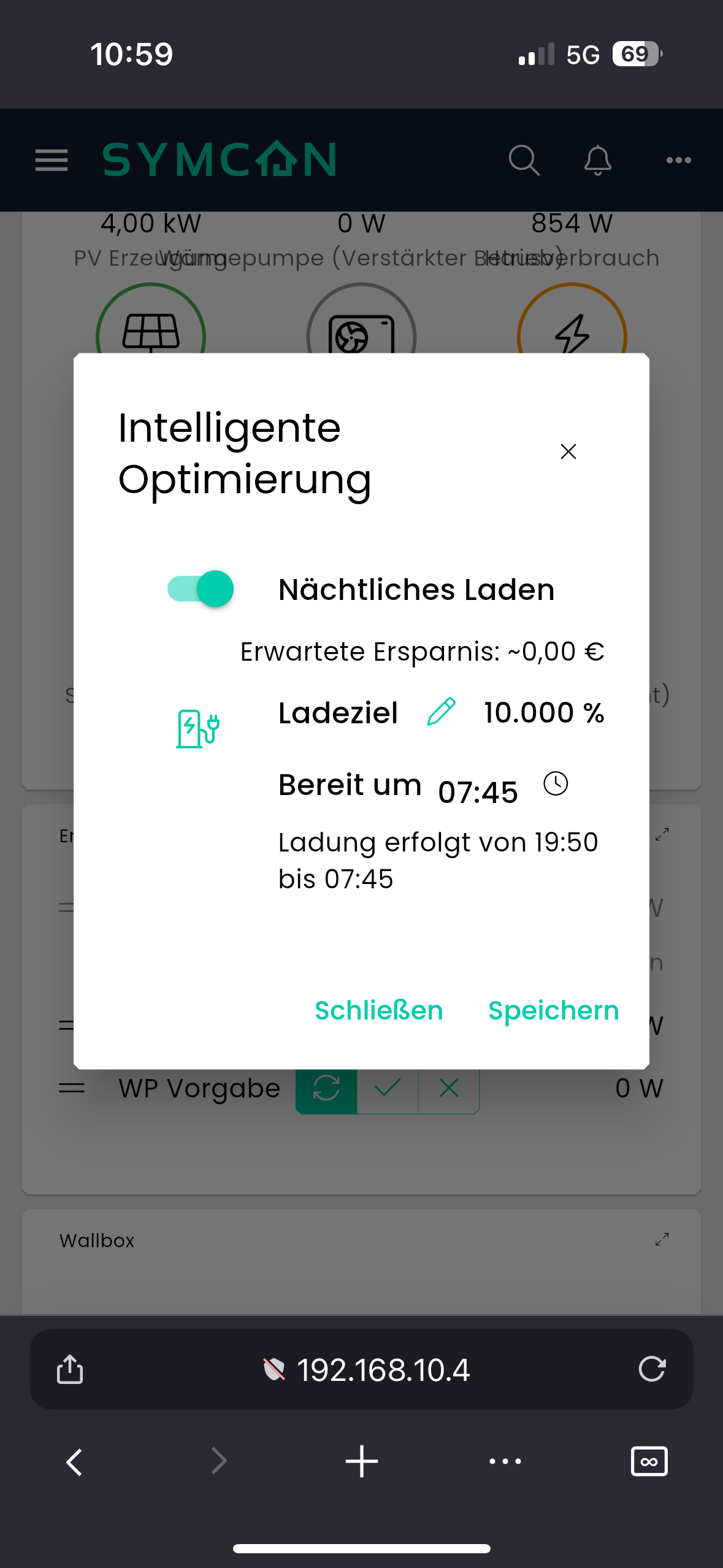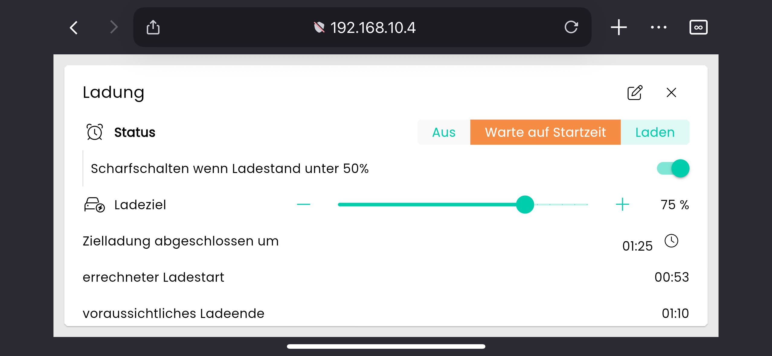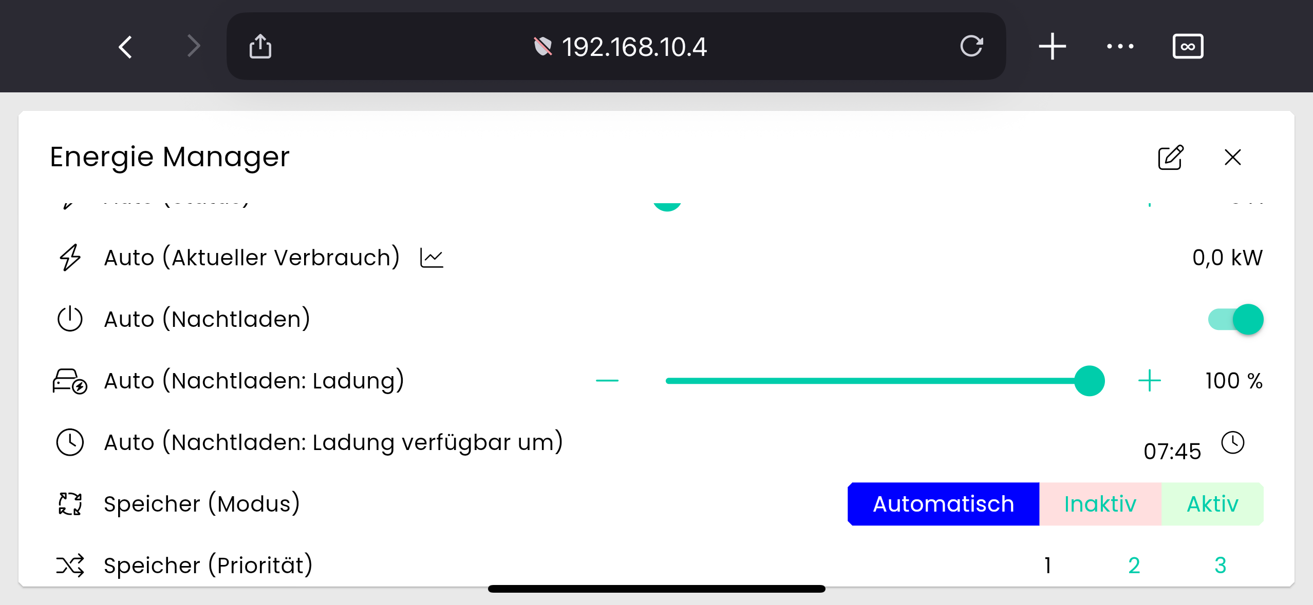 Beim Nachtladen wird die Prozentanzeige beim maximieren des Energie managers falsch dargestellt. Werte unter 100% sind immer 1. Wenn ich dort 100% einstelle wird 10000% draus. Da stimmt also die Darstellung in der Standard Konfiguration nicht. Mir ist klar wie ich das fixen kann, aber schön ist das nicht.