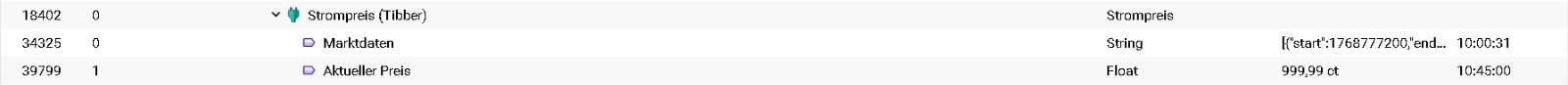 Ich habe auch bereits ein anderes Strompreismodul (GitHub - symcon/Strompreis: Liest die aktuellen/vorhergesagten Strompreise von aWATTar, Tibber oder Epex Spot DE aus) ausprobiert, da ich ebenfalls das Problem in der Variablen sah. Es hat aber leider nichts geändert. Kann es eventuell mit der Umstellung von 1h-Abrechnung auf 15-Minuten-Abrechnung zusammenhängen?