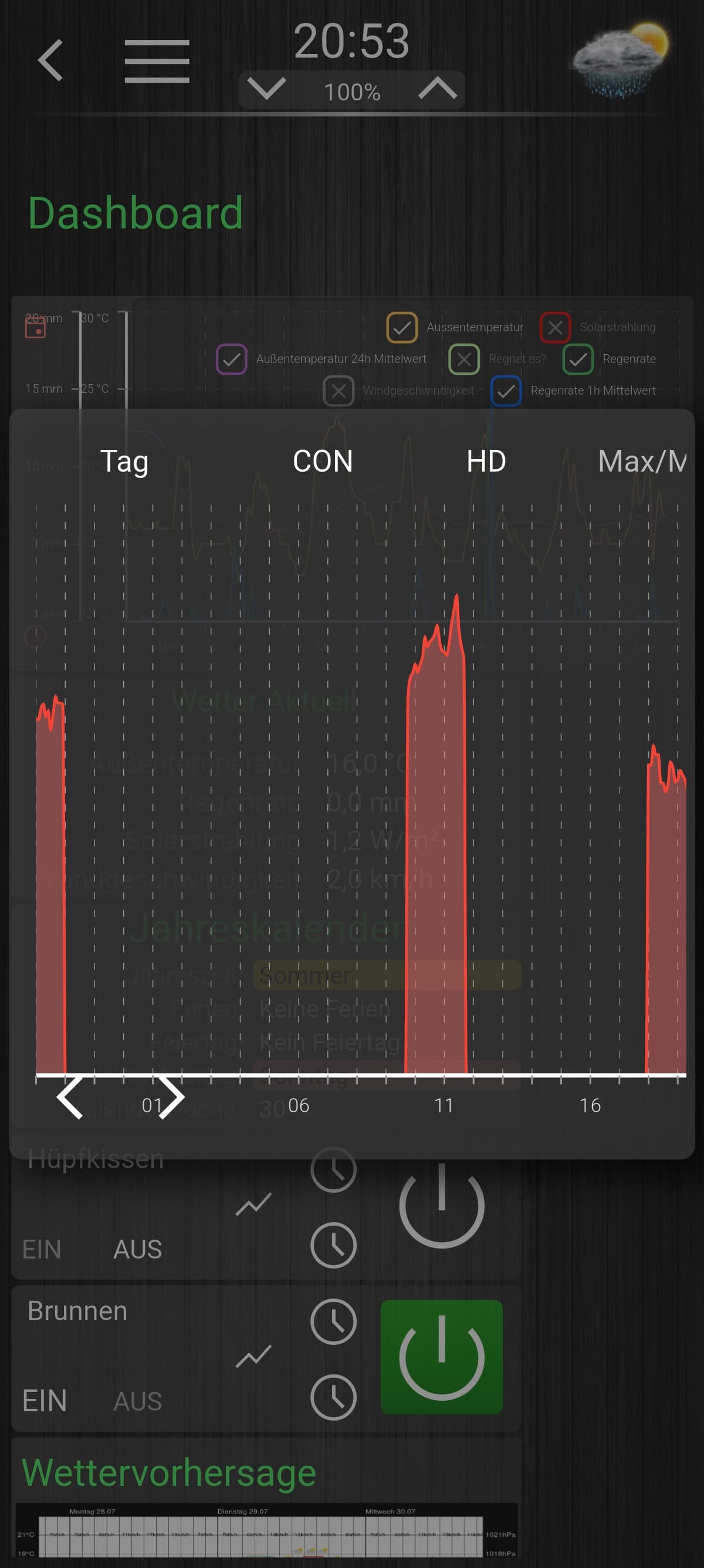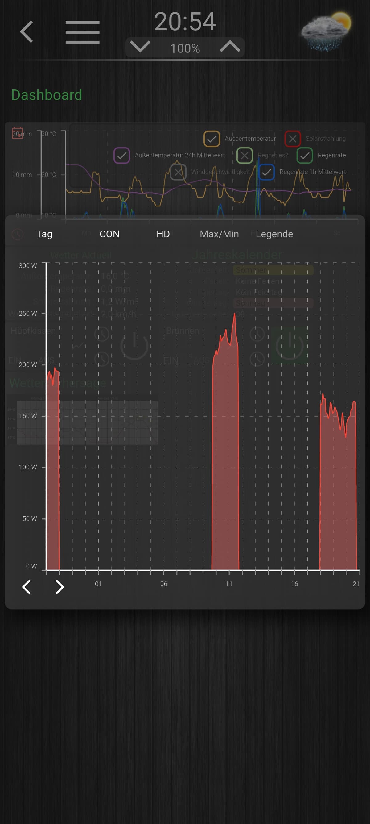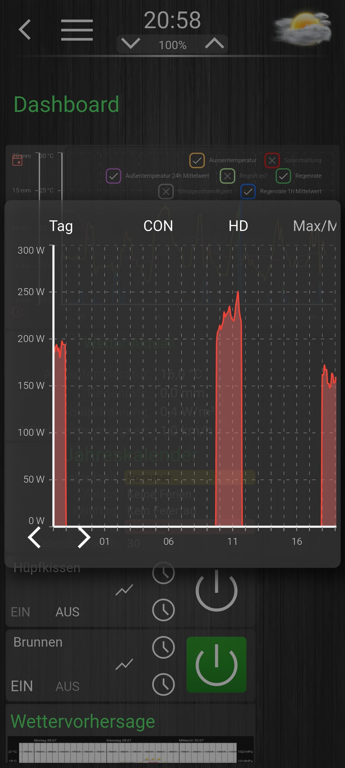 Hallo, hab auch eine kurze Frage. @Brownson Ich nutze deine Vorlage und schaff es einfach nicht dass Graphen auf dem Handy ordentlich angezeigt werden. Wenn ich den Zoomfaktor auf der Main-Seite „Mobile“ auf 0,5 stelle, dann werden alle Graphen ordentlich dargestellt. Aber alles andere ist so klein das es nicht mehr nutzbar ist. Wenn ich diesen Faktor auf 0,8 stelle (so ist es von der Größe der Schaltflächen auf dem Handy noch gut) dann werden alle Graphen rechts und links abgeschnitten.