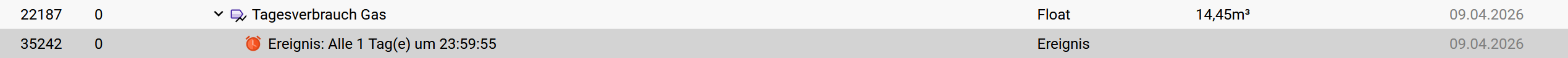 Hallo, ich hoffe, das Thema passt hier hin. Ich erzeuge jeden Tag um 23:59:55 einen Wert für meinen Tagesgasverbrauch. Wenn ich jetzt einen Graph damit erstelle und die Wochenansicht wähle bekomme ich den Wert aber immer am folgenden Tag angezeigt. Auch bekomme ich für jede Stunde und auch für Minuten Werte angezeigt, obwohl nur ein Wert pro Tag erzeugt wird. Kann ich das so einstellen, dass wirklich nur ein Wert je Tag archiviert wird?