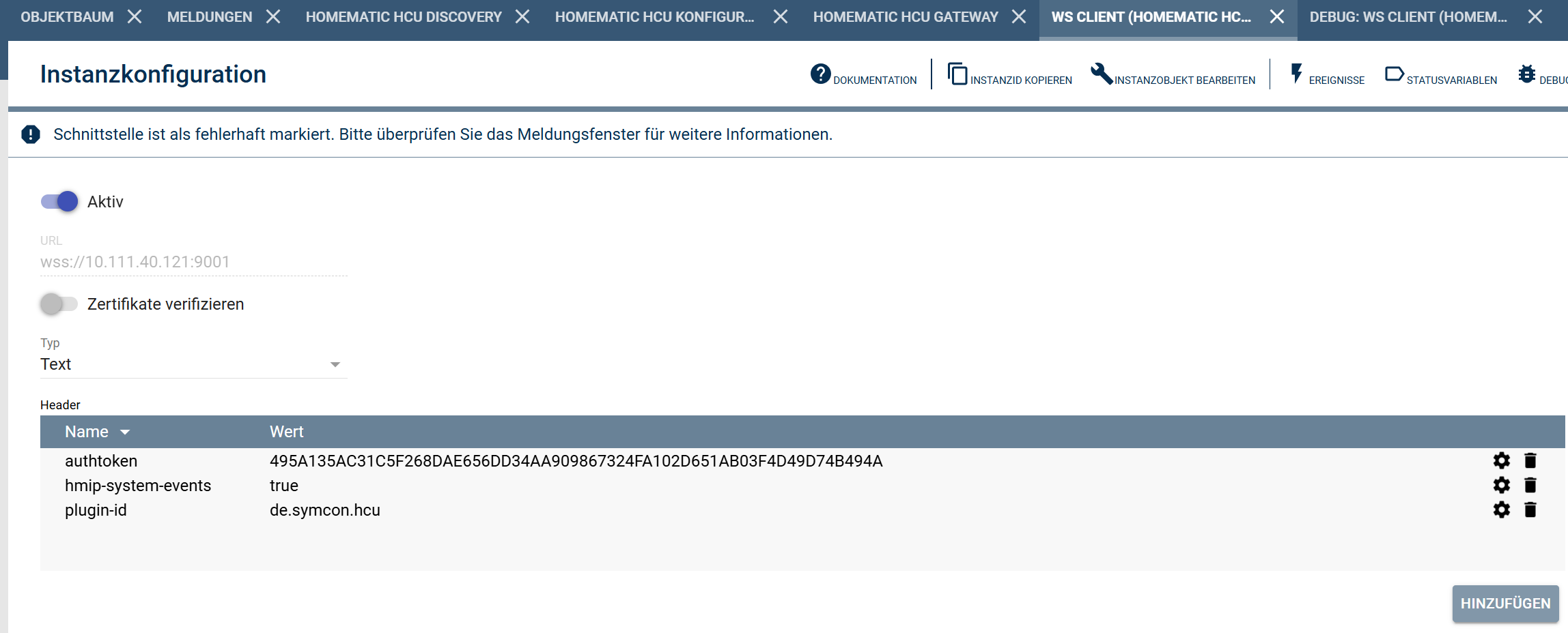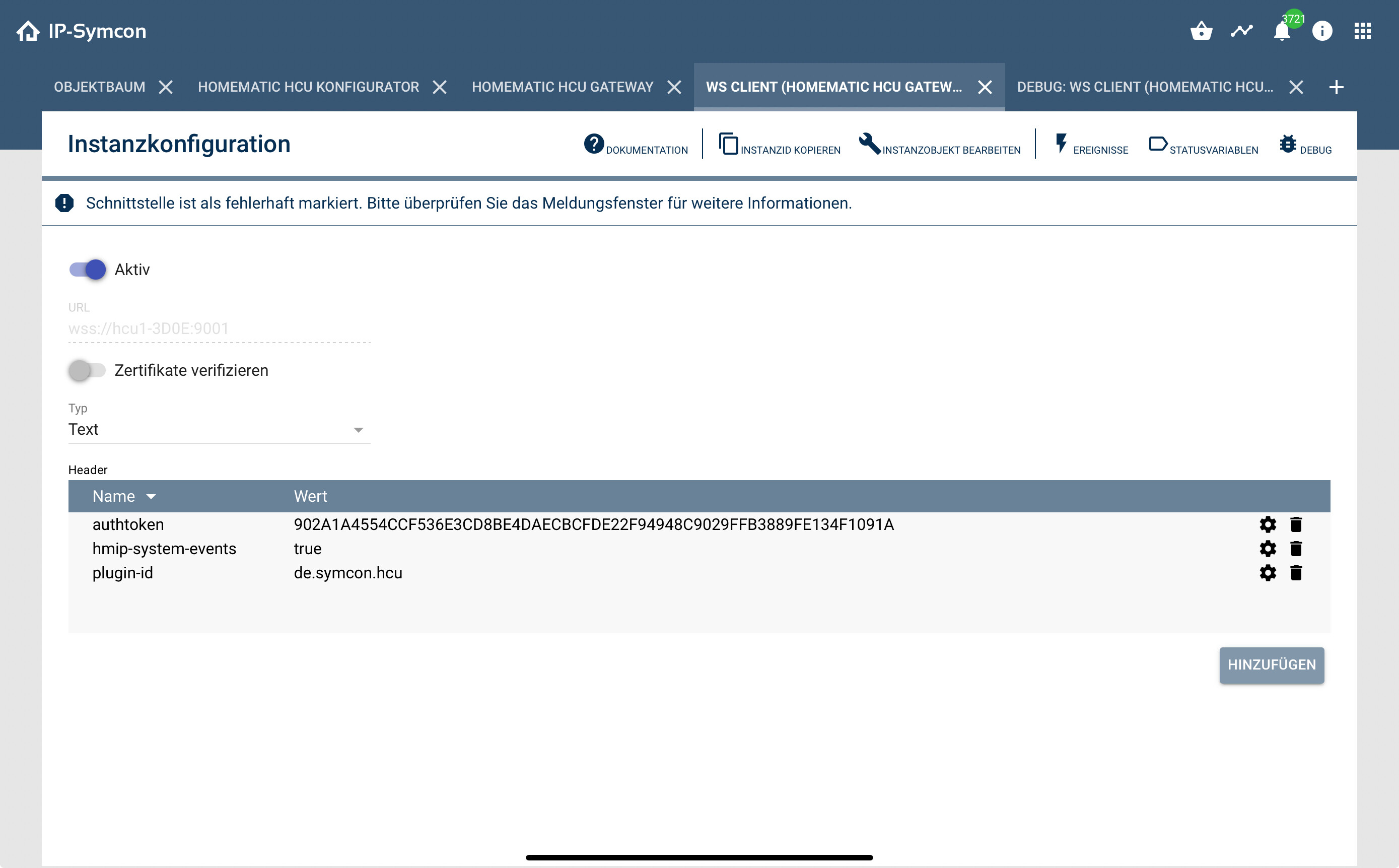 Die Anbindung der HCU habe ich rein über die IP Adresse gemacht (sowohl der PI mit IP Symcon als auch die HCU sind im gleichen Netzwerk und haben beide eine feste IP), die initial Kommunikation funktioniert auch. Denn im WS Client sehe ich den authtoken und die Homematic IP App meldet mir auch das ein „Smartphone“ hinzugefügt wurde. Jedoch passiert danach nichts mehr. Ich sehe nur diese Meldungen im Debug Protokoll: