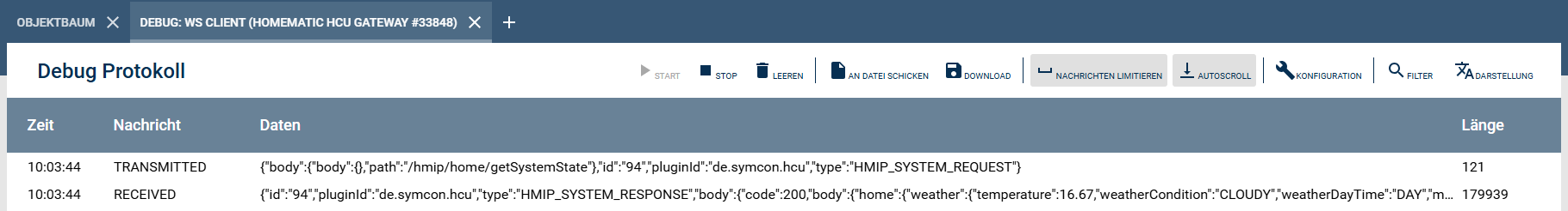 Im Debugger sieht man, dass im Minutentakt neue Daten von den HCU Geräten reinkommen.