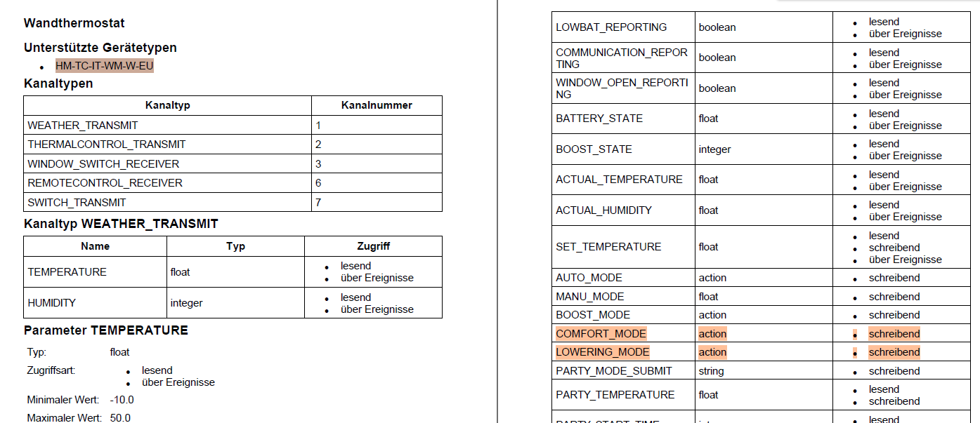 Ich glaube hier liegt eine Verwechslung vor. So wie ich das erkennen kann, handelt es sich in deiner Antwort um das HM-CC-TC. Ein Wandthermostat anscheinend auf Homematic IP Basis. Ich habe aber die Raumthermostate die sich HM-TC-IT-WM-W-EU nennen. Ich habe die Raumthermostate integriert und es sind alle Instanzen gesetzt worden. Leider finde ich hier keine mit dem Namen LOWERING_MODE oder COMFORT_MODE.