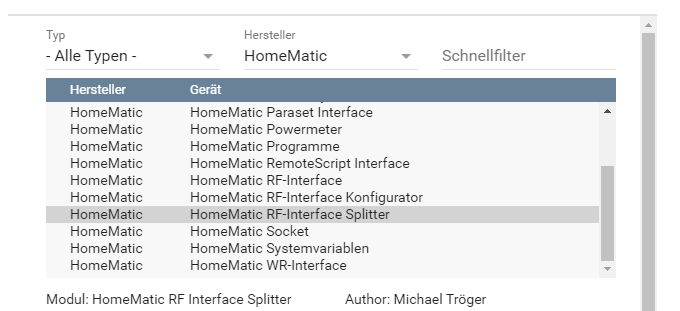 Benutze oben rechts den Schnellfilter um z.B. nach Homematic zu filtern.