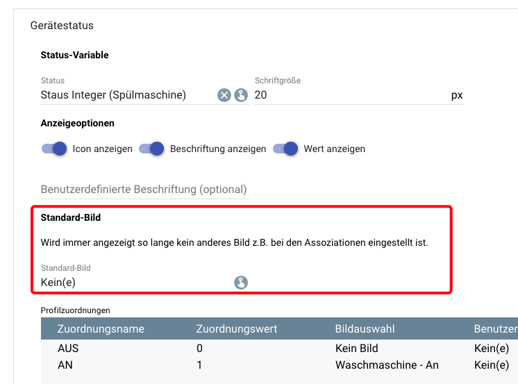 Da wäre es schön, wenn man das Bild direkt in der Gruppe „Kachel Design“ angeben könnte. Dann bräuchte man beim Gerätestatus nur abweichende Bilder angeben und hätte es etwas leichter. Momentan muss man das gleiche Bild hier acht mal angeben wenn ich es richtig sehe: