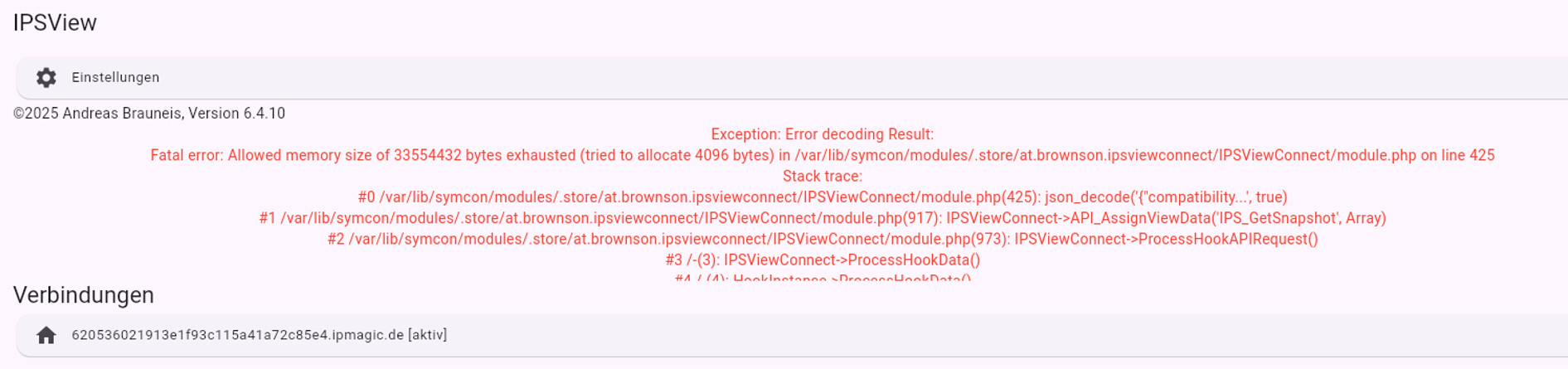 Ipsview von bestehender Symcon Installation auf einem PI exportiert und in Symcon wieder importiert. Fehlermeldung wie weiter oben im Bild zusehen immer wieder bekommen. Visu gelöscht kleine einfache Standard Visu mit Vorlage importiert (3 Seiten ohne Bilder) immer noch der gleiche Fehler. Auf Empfehlung den memory_limit von 32 auf 64 erhöht was nach meiner meinung nicht die uhrsache sein kann wegen der Standard IPSview. Shared memory size im Container Symcon von Docker auch auf 64 erhöht. Fehler immer noch vorhanden.