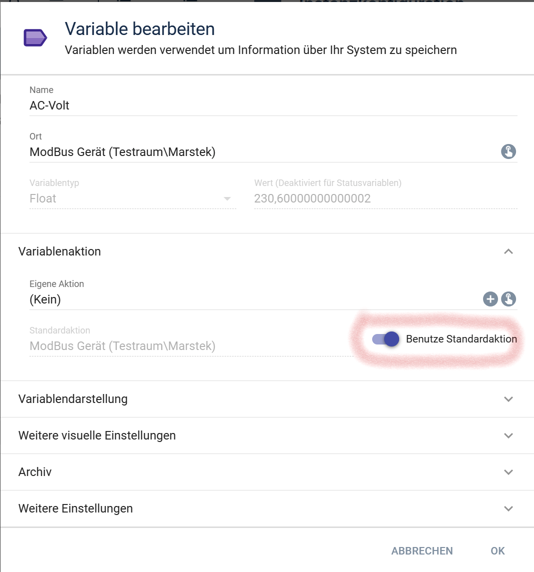 Die Geräte werden von Symcon so angelegt also mit der Standardaktion. Bei den Variablen die nur einen Wert anzeigen sollen, kannst das raus machen. Aber die Variablen die Verstellbar sein sollen bzw. ein write Register bzw. Funktion haben, da brauchst die Standardaktion sonst kannst im Webfront nicht bedienen.