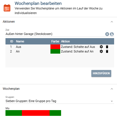 Hallo zusammen, erstmal vielen Dank für die Antworten. Gute Info war, dass der Wochenplan nur einmal schaltet, dann verstehe ich auch warum es bei Bewegungserkennung und keiner Bewegung dann wieder ausschaltet.