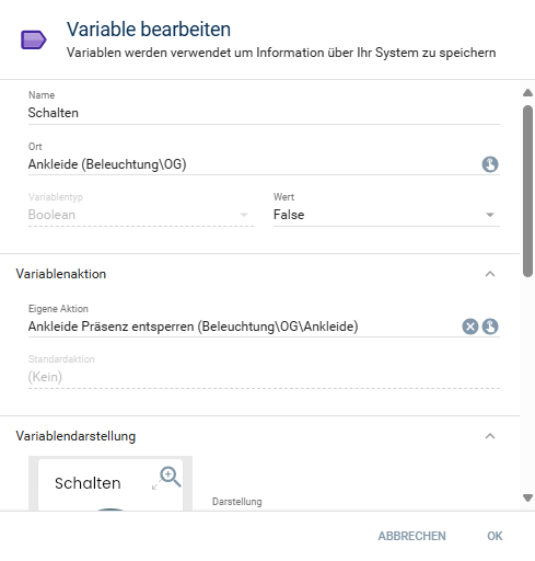 Bei Schalten Objekt 56179 → Objekt bearbeiten steht Standardaktion (kein) . Hier müsste Ankleide (Beleuchtung/OG) stehen. Dies kann ich aber nicht auswählen.