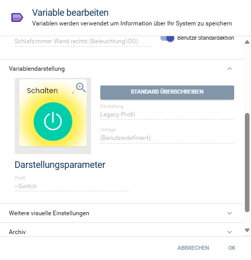 Leider habe ich bei der Aktion den “Schalter” um das Licht per IP-Symcon App zu steuern gelöscht. Und nun kann ich es nicht mehr erstellen, mir fehlt die Auswahl des Aktionsskriptes bzw. des Standardscriptes. Hier ein gutes Beispiel dann die Übersicht und dann meine Problemvariable “Schalten”. Leider kann ich die Standardaktion nicht auswählen, denke da liegt mein Problem.