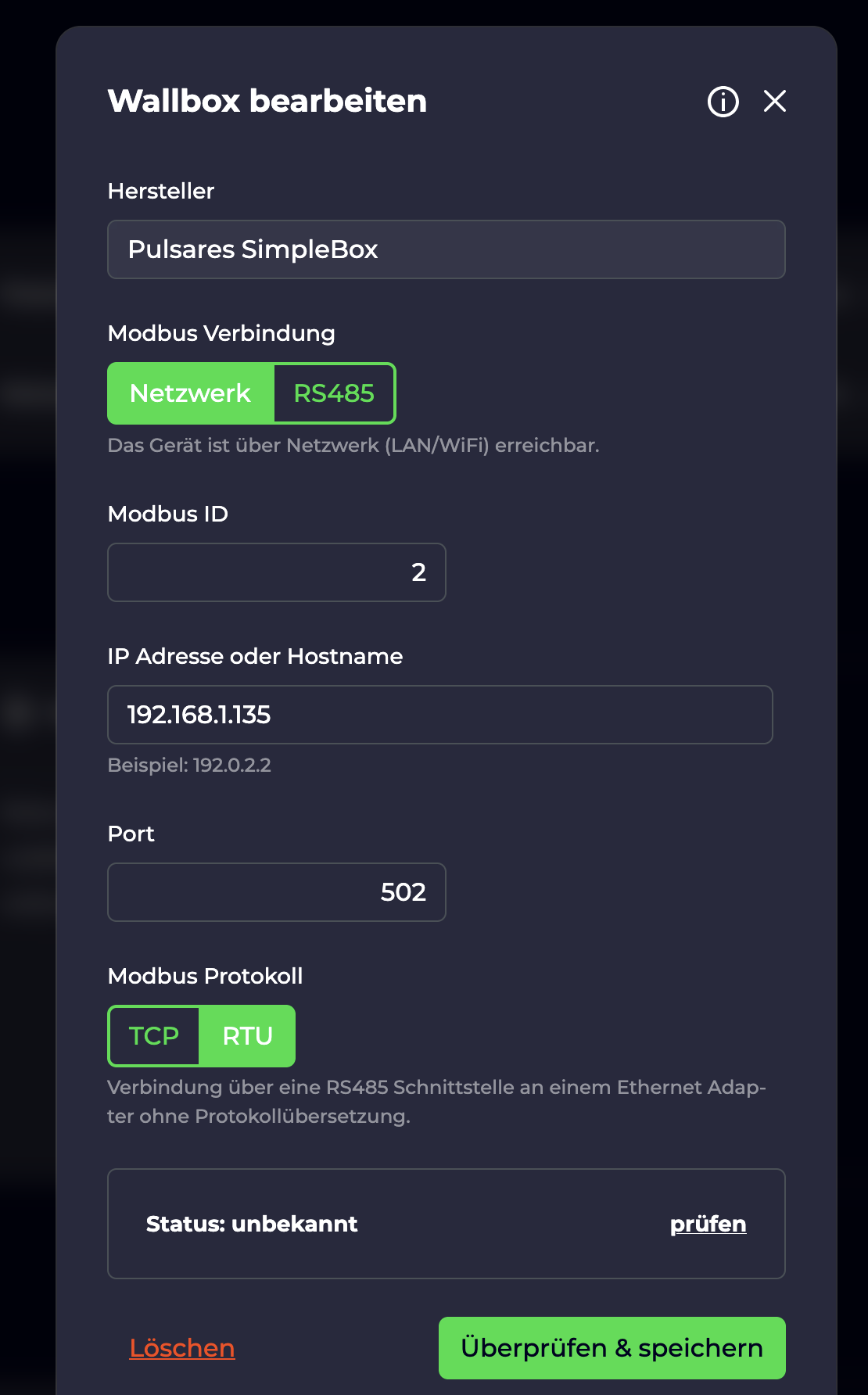 Ich habe eine selbstgebaute Wallbox mit einem Pulsares Controller. Dieser hängt an einem Waveshare Konverter RS485 to TCP. Die Daten werden primär von dem evcc Tool verwaltet. Das klappt soweit auch gut.