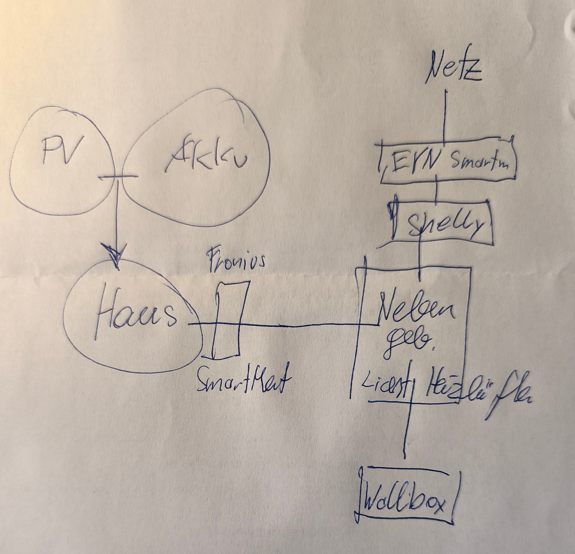 Du hast den Verbrauch „Haus“ du hast ie Produktion „PV“ und den „SOC“,dazu hast du den Gesamtverbrauch aus dem Shelly, somit auch den Verbrauch Nebengebäude mit Wallbox.