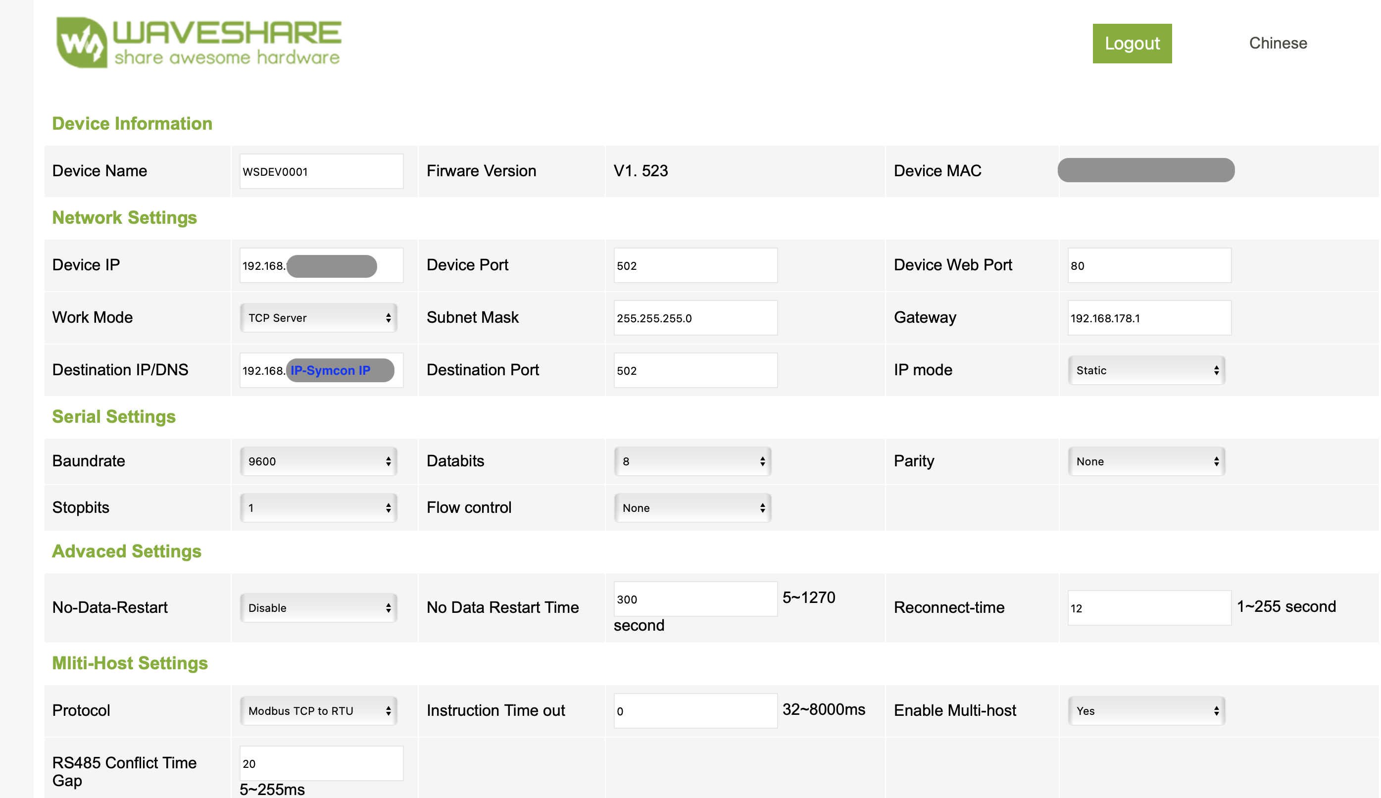 Wichtig sind die Ports 502, Baudrate 9600 sowie die IP-Adressen vom Waveshare (statisch einrichten! und Symcon)