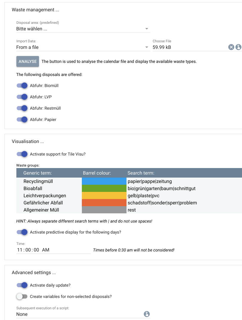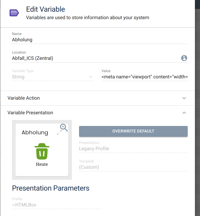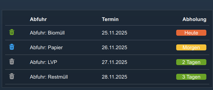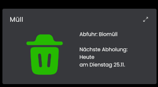 Hi, super Modul, zumindest in der WebFront Visu für mich. Versuche nun das Tile fürs Handy rein zu nehmen, aber mir wird nur die heutige Abholung angezeigt die schon längst weg ist. Das Interessante wäre aber was morgen dran ist.