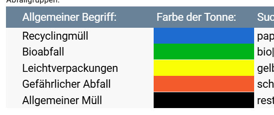 Passt den der Suchbegriff zu deiner Abfallart, also wenn die Art = „Wertstofftonne“ ist, dann sollte bei Suchbegriff sowas wie „wertstoff“ stehen!