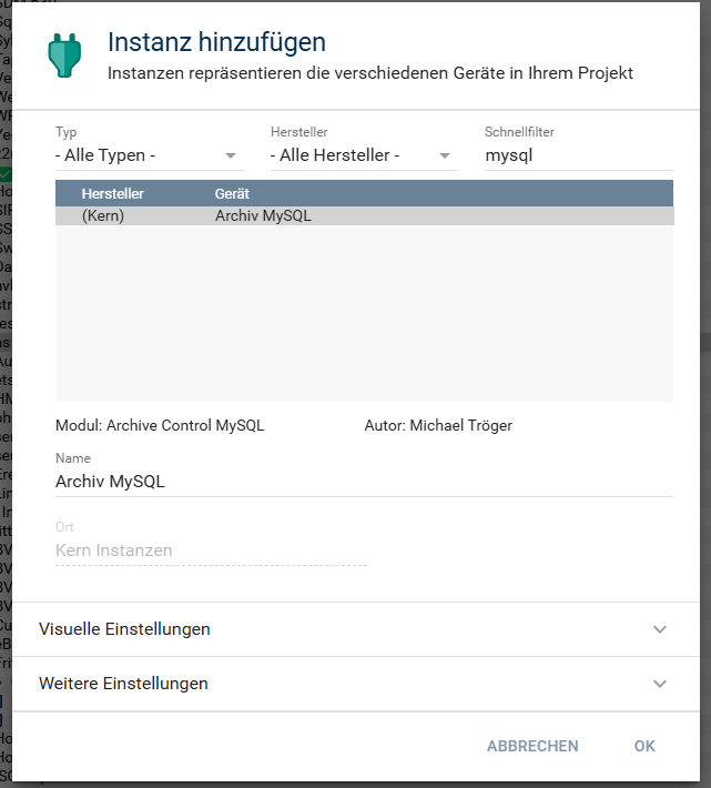 Über den Module-Store in Symcon das Modul MySQL Archiv hinzufügen. Bei kommerzieller Nutzung (z.B. als Errichter oder Integrator) wenden Sie sich bitte an den Autor.