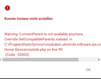 Warning: ConnectParent is not available anymore. Override GetCompatibleParents instead. in C:\ProgramData\Symcon\modules\.store\de.wilkware.ips.modul.blink\Blink Home Device\module.php on line 99