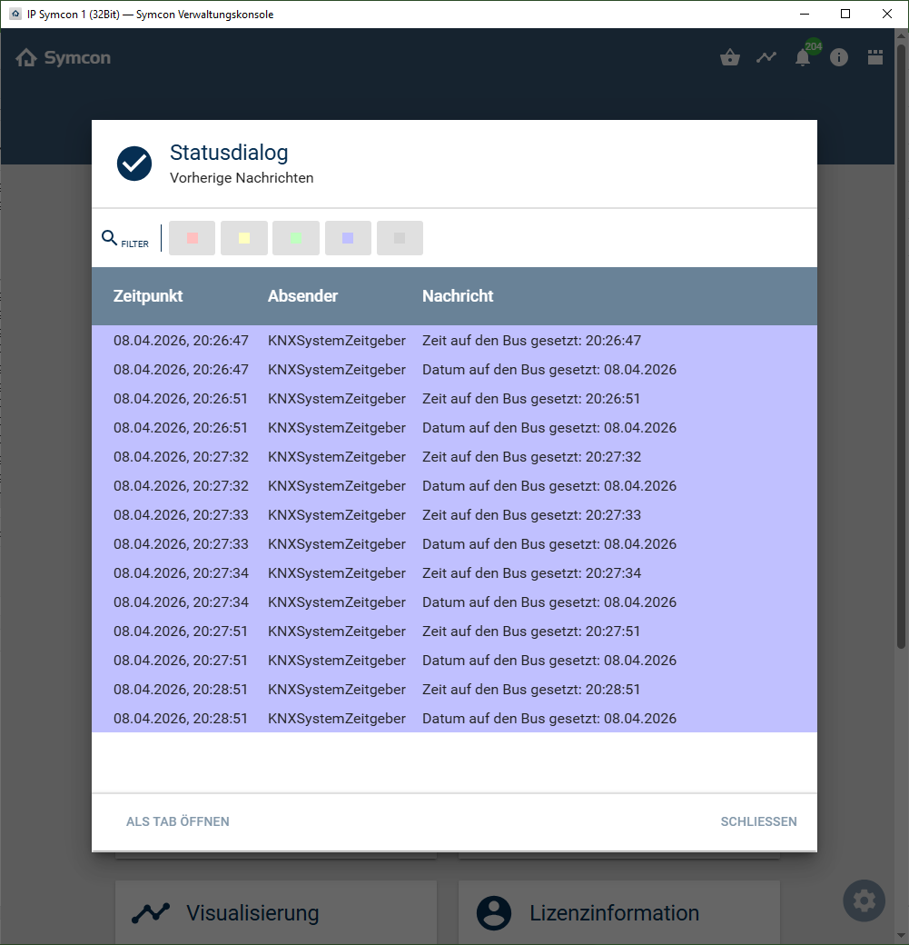 Empfehlung: Die Zeiten nicht zur vollen Stunde, insbesondere nicht um 00:00 Uhr, setzen zu lassen. Zur vollen Stunde, insbesondere zur Mitternachtszeit, laufen gerne andere automatische Funktionen, die das Setzen der Zeit auf den Bus kurzzeitig blockieren könnten. Um Mitternacht läuft beispielsweise von Symcon die Log-Rotation, die kurze Verzögerungen verursachen könnte. Zu empfehlen ist das Setzen der Zeit kurz nach 03:00 Uhr, da dann auch die Zeitumstellung erfasst wird. Darüber hinaus können ein oder zwei weitere Aktionen über den Tag verteilt hilfreich sein, wenn einmal der Strom weg war. Dann ist die Zeit wieder schnell gesetzt.