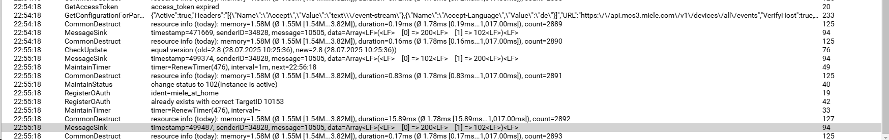 Kann ich bestätigen, das Log ist immer wieder voll mit Fehlermeldungen. Zwischendurch funktioniert es dann auch mal wieder. Bei Miele läuft das echt semi mit der API…ob das dann mit der neuen Besser läuft?