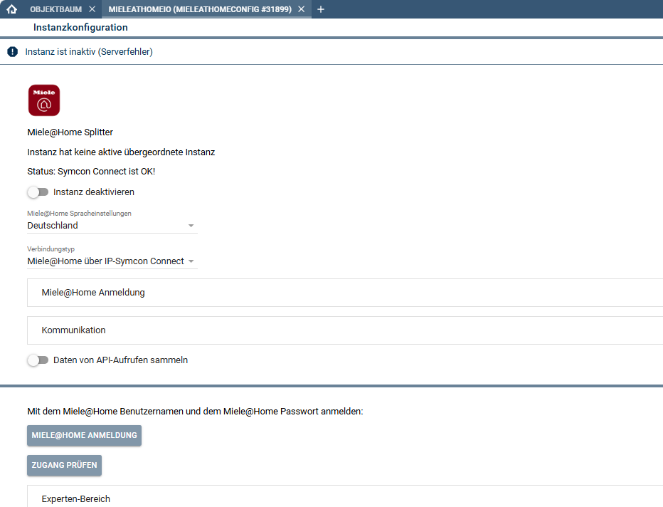 ich hatte nun auch für einige Zeit das “Server Error 500” Problem. Miele@Home Anmeldung hat erfolgreich funktioniert, aber Zugang prüfen hat dann fehlgeschlagen. Bei mir hat ein einmaliger Login mit falschen Zugangsdaten (es tritt dann bereits beim Login ein Fehler auf) und danach ein neuer Login mit den korrekten Zugangsdaten geholfen. Nun funktioniert die Verbindung wieder.