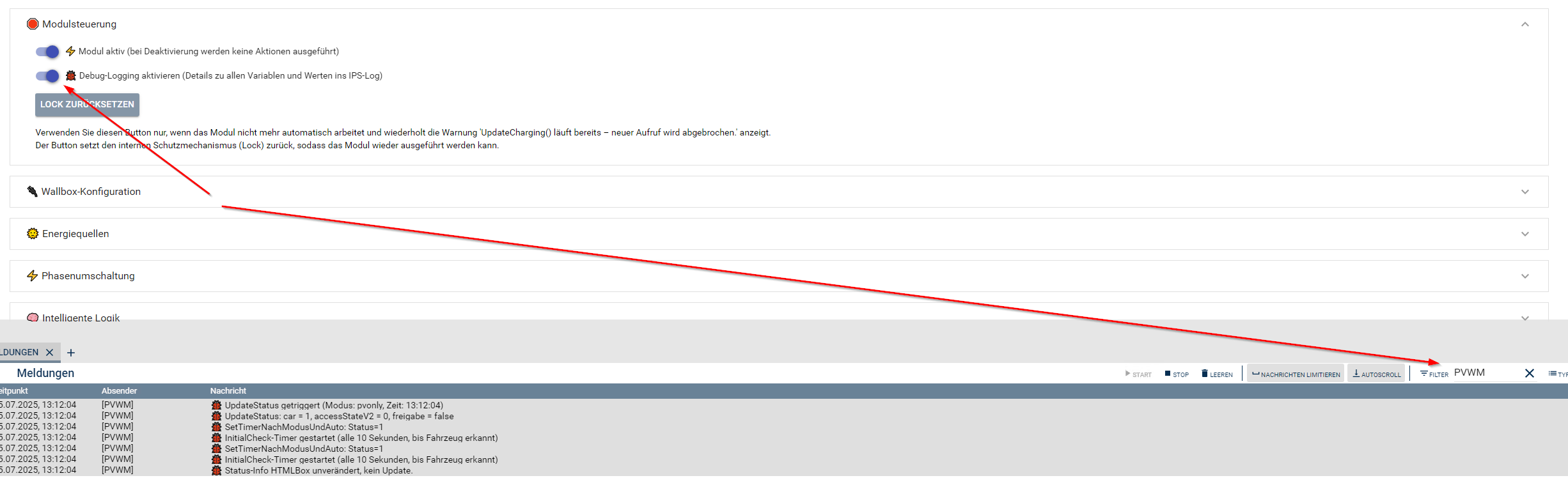 Initial-Check Intervall: hier checkt der PVWallboxManager alle x Sekunden ob ein Fahrzeug angeschlossen ist. Sobald die Wallbox ein Fahrzeug erkennt, schaltet das Modul in den Aktualisierungsintervall um und Berechnet dann auch den PV-Überschuss.