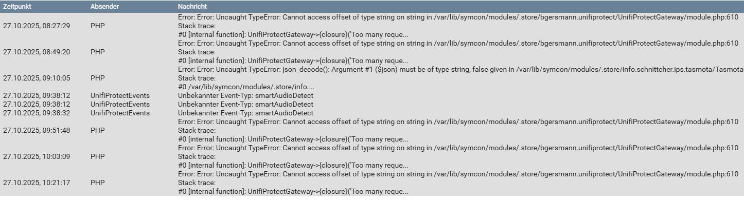 24.10.2025, 17:36:40 | PHP | Error: Error: Uncaught TypeError: Cannot access offset of type string on string in /var/lib/symcon/modules/.store/bgersmann.unifiprotect/UnifiProtectGateway/module.php:610Stack trace:#0 [internal function]: UnifiProtectGateway->{closure}(‚Too many reques…‘, ‚TOO_MANY_REQUES…‘)#1 /var/lib/symcon/modules/.store/bgersmann.unifiprotect/UnifiProtectGateway/module.php(609): usort(Array, Object(Closure))#2 /var/lib/symcon/modules/.store/bgersmann.unifiprotect/UnifiProtectGateway/module.php(91): UnifiProtectGateway->getDevicesConfig()#3 /-(3): UnifiProtectGateway->ForwardData(‚{„DataID“:"{BBE…‘)#4 {main}thrownError in Script /var/lib/symcon/modules/.store/bgersmann.unifiprotect/UnifiProtectGateway/module.php on Line 610