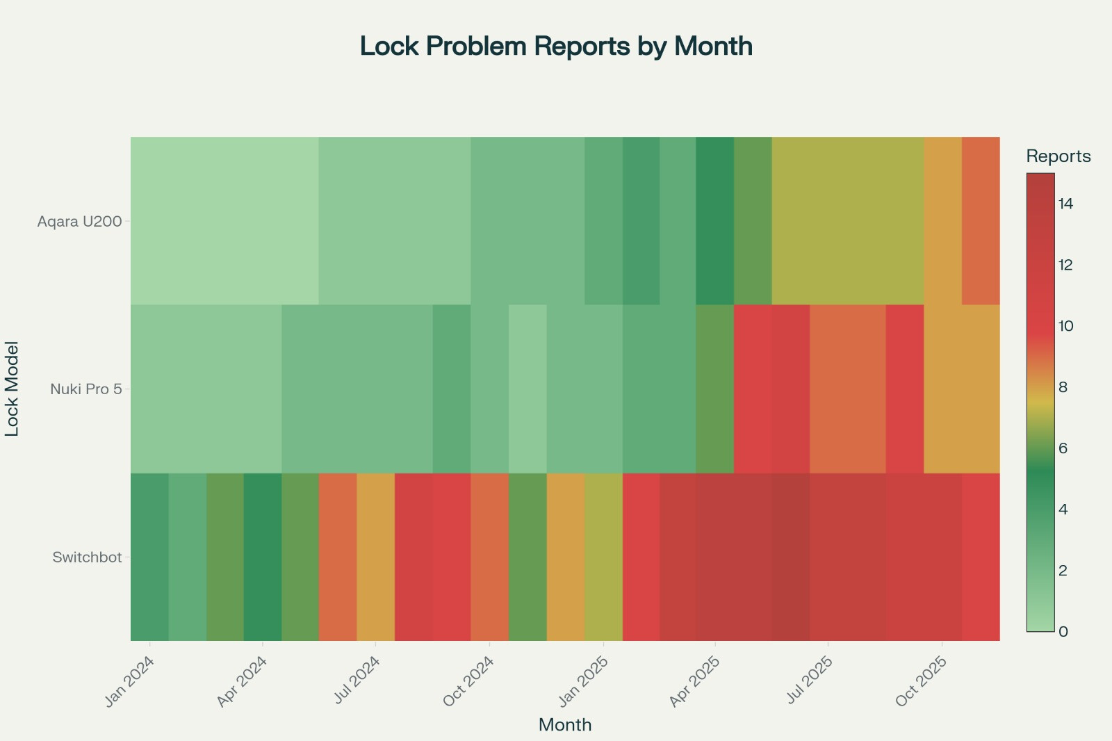 Da ich gerade zu 2 anderen Schlössern tendierte habe ich mal mit Ki das Netz von folgenden 3 Schlössern nach Problemen durchsuchen lassen und diese in Anzahl zeitlich auf einer Heatmap darstellen lassen. Entsprechend dem Ergebnis und dem Black Friday Angebot (149€) hab ich mich gestern für das Aqara U200 mit KeyPad (Fingerprint) entschieden. Mal sehen wie das so perfomed. Hier hat mich auch das Apple Key System gelockt, so kann ich auch mit meiner AppleWatch entsperren in dem ich sie einfach dran halte.