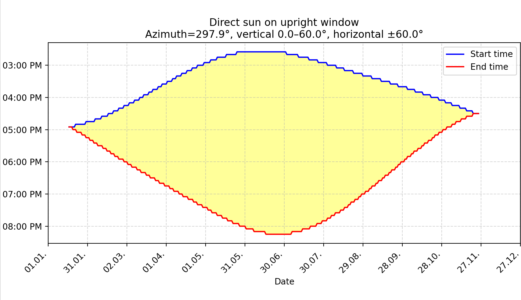 Plot the start and end local times of direct sun on the window