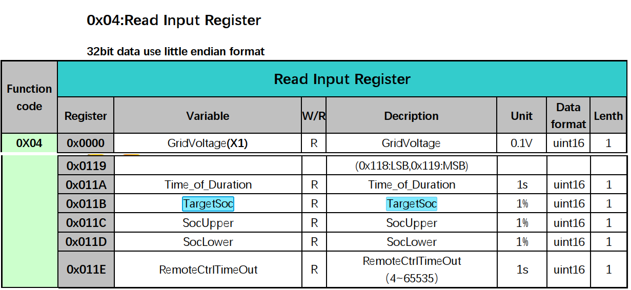 zu1. Ja das ist seltsam, da sollte erwartend minSOC stehen. Tatsächlich ist mir dort sogar ein Fehler unterlaufen. Statt 283 (0x011B Hex) habe ich 282 geschrieben. Ändert aber auch nichts am Ergebnis