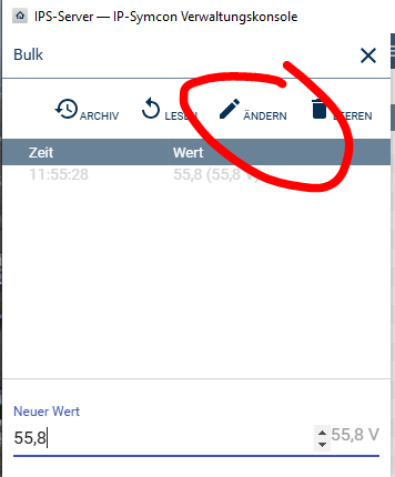 Wenn ich nun Bulk ändern will, gehen ich einfach in den Baum klicke rechts auf den Wert der Variable, tipp 55,8 ein, klick auf ändern und dann schalten.. fertig