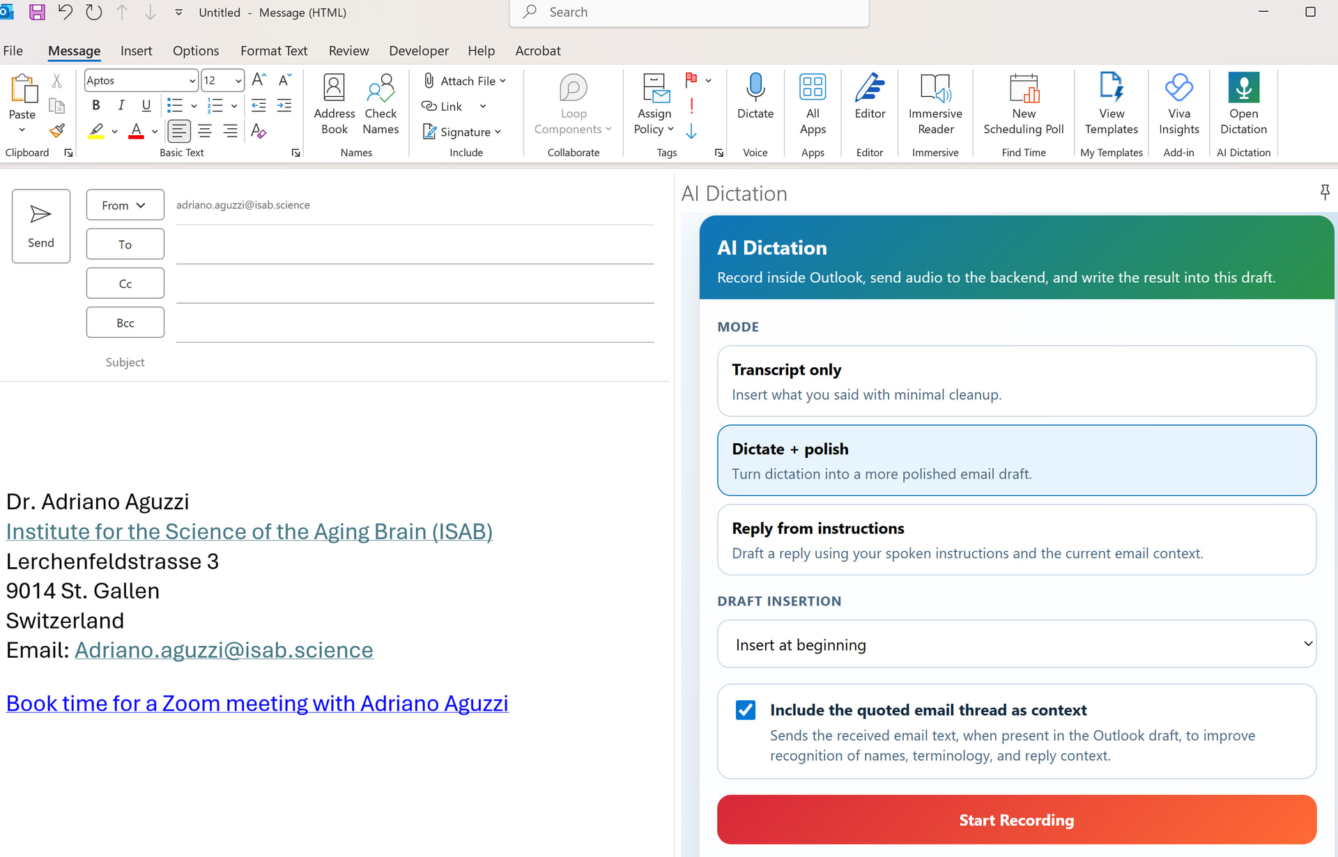 Bin nicht sicher, ob es jemanden hier interessiert, aber ich habe ein Outlook-Plugin kodiert welches mir erlaubt, emails zu diktieren. Grund ist, dass ich kein Mensch mehr bin, sondern mich in eine Email-Antwortmaschine verwandelt habe (so wie Gregor Samsa ).