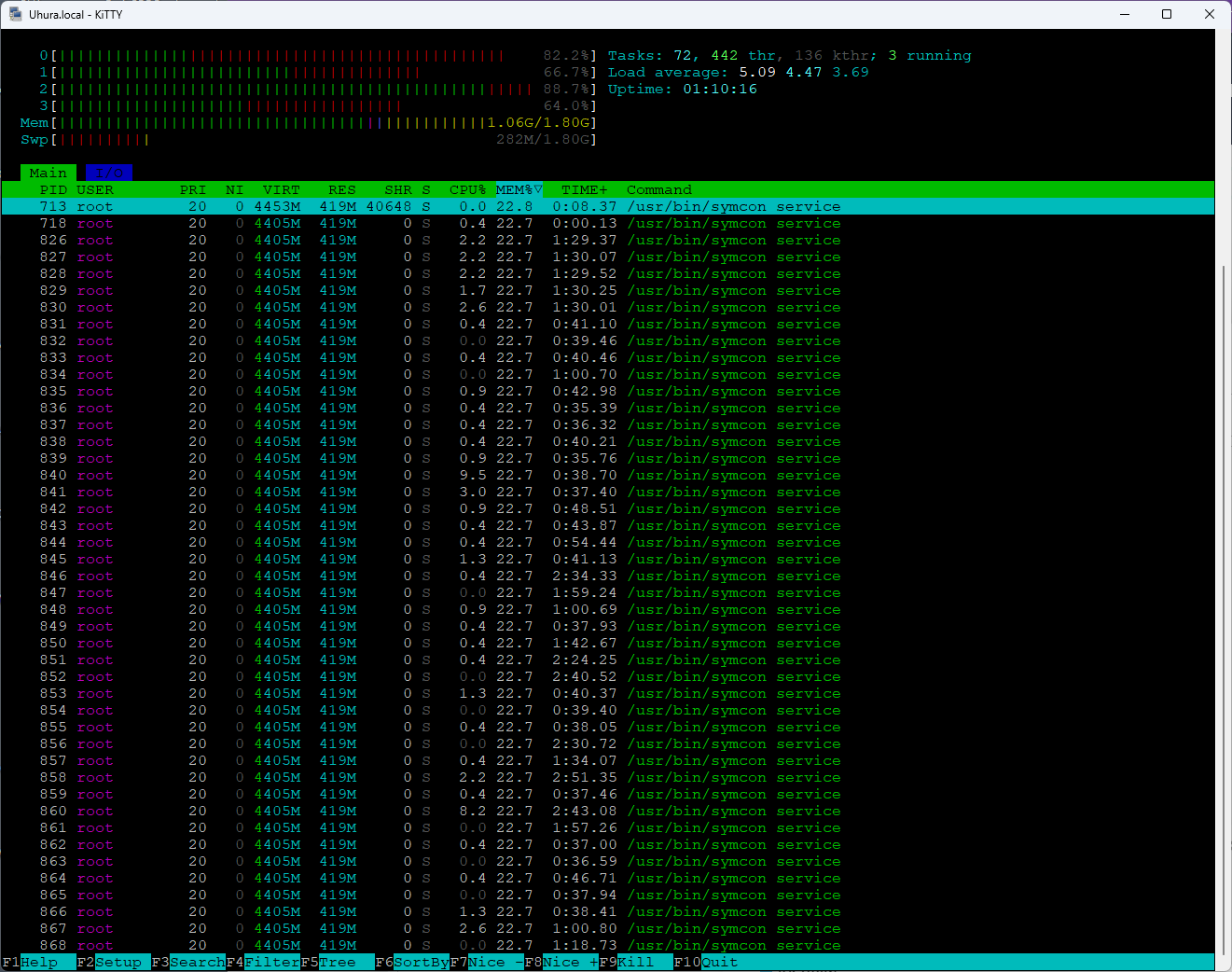 das sieht ja nicht so gesund aus. Es swapt wohl ohne Ende - und das auch sofort nach einem Reboot. Ich verstehe auch nnicht, dass da laut Prozessmonitor (die Liste ist länger) 200 Threads in Symcon belegt sind. In Symcon merke ich das an erhöhten Antwortzeiten.