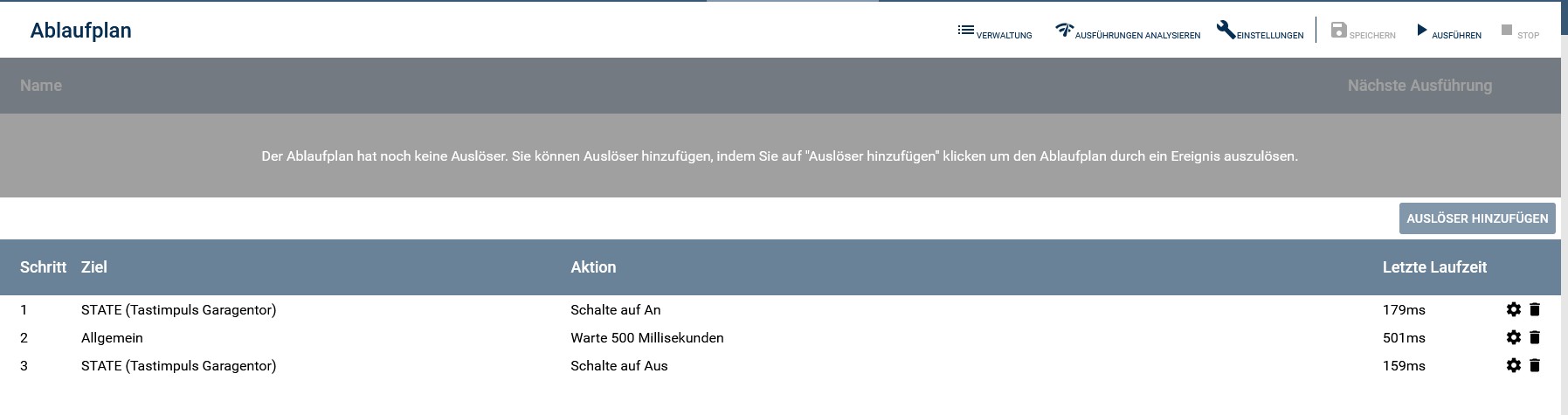 Stehe gerade ordentlich auf dem Schlauch. Suche eine Instanz / Funktion welche analog eines Taster funktioniert. Sprich: Ich betätige sie und sie setzt mir einen Ablaufplan um.. Geht hauptsächlich um die Visu → habe dort nur die Funktionen mit einem klassichen Schalter, sprich das Icon bleib dann eingeschaltet… Dabei brauche ich nur einen Impuls und das Icon sollte beleiben wie es ist. Da ja ein Ablaufplan nicht ausgeschaltet werden muss….