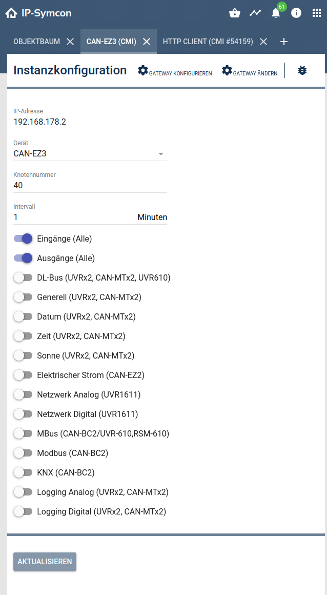 Was leider nicht funktioniert ist das Anlegen einer Instanz für diese CAN-EZ3 in Symcon.
