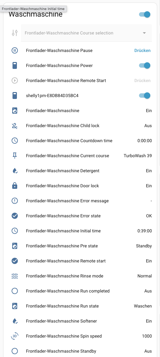 Waschmaschine läuft aktuell und sendet Daten (sehe ich über HomeAssistant):
