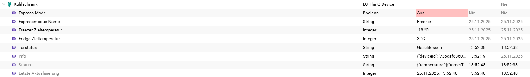 Ich habe den Konfigurator angelegt und der LG Bridge zugeordnet. Mein Kühlschrank wurde auch direkt angezeigt und konnte erstellt werden.