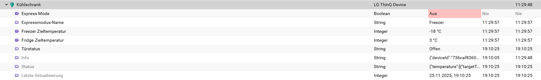 Weiters kann ich das Ding jetzt nur ein/ausschalten und den Status-String sehen. Sonst sehe ich noch keine anderen Variablen (Also nur Betriebszustand,Power,Info,Status,LastUpdate)