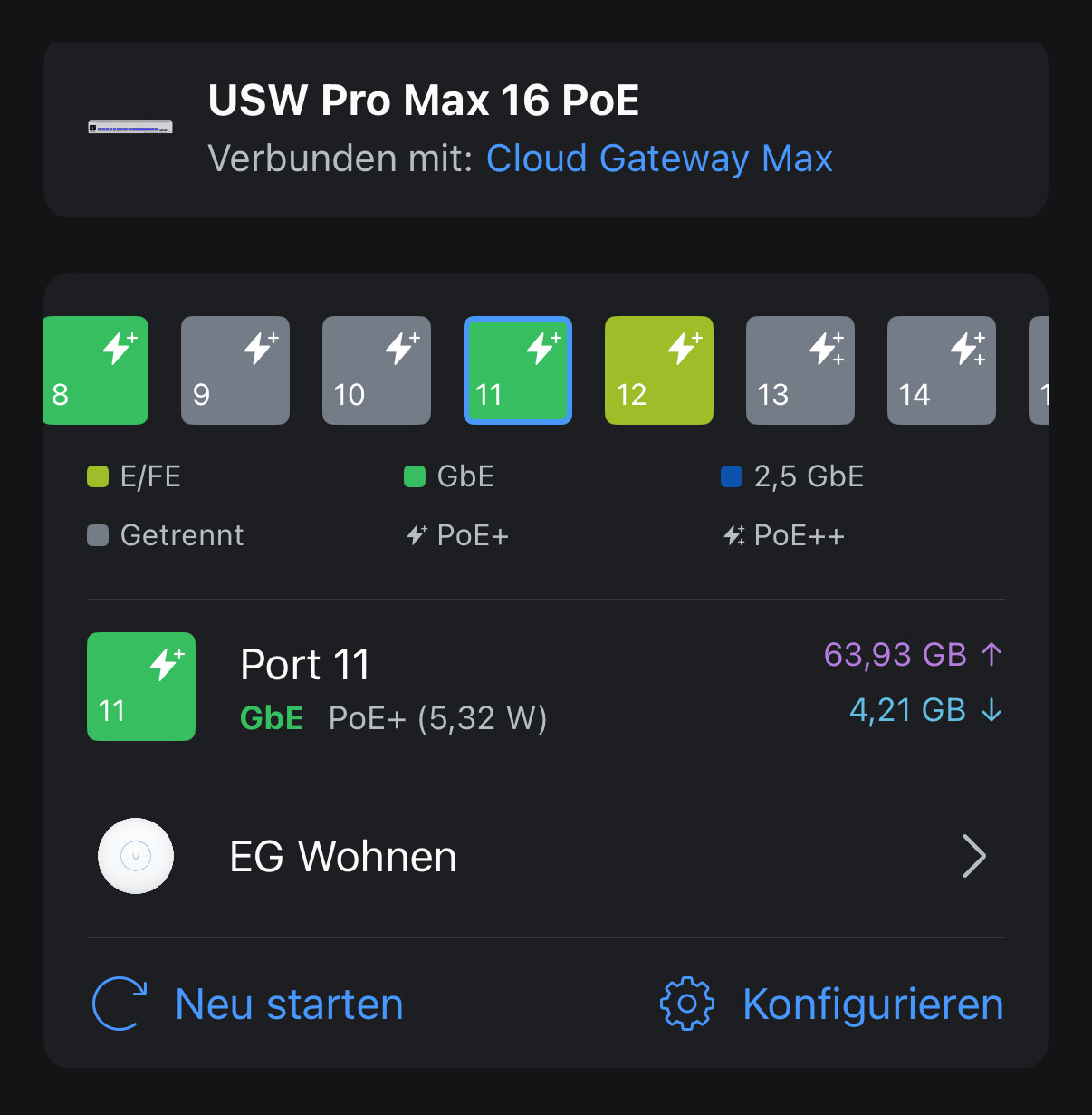 Du kannst auch in den Settings am Portmanager sehen, ob der U7 Pro an dem Port vom Switch angeschlossen ist oder nicht.