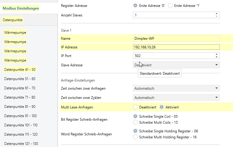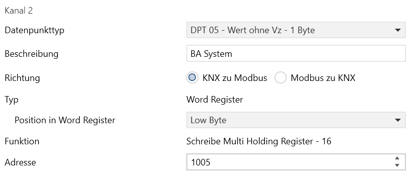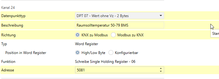Moin, ich versuche bis jetzt vergeblich einen R/W Befehl mit dem Weinzierl 716 zu konfigurieren. Read ist kein Problem, aber wie geht Write (KNX to Modbus)? In Symcon geht das problemlos. Nur mit Weinzierl stehe ich auf dem Schlauch…