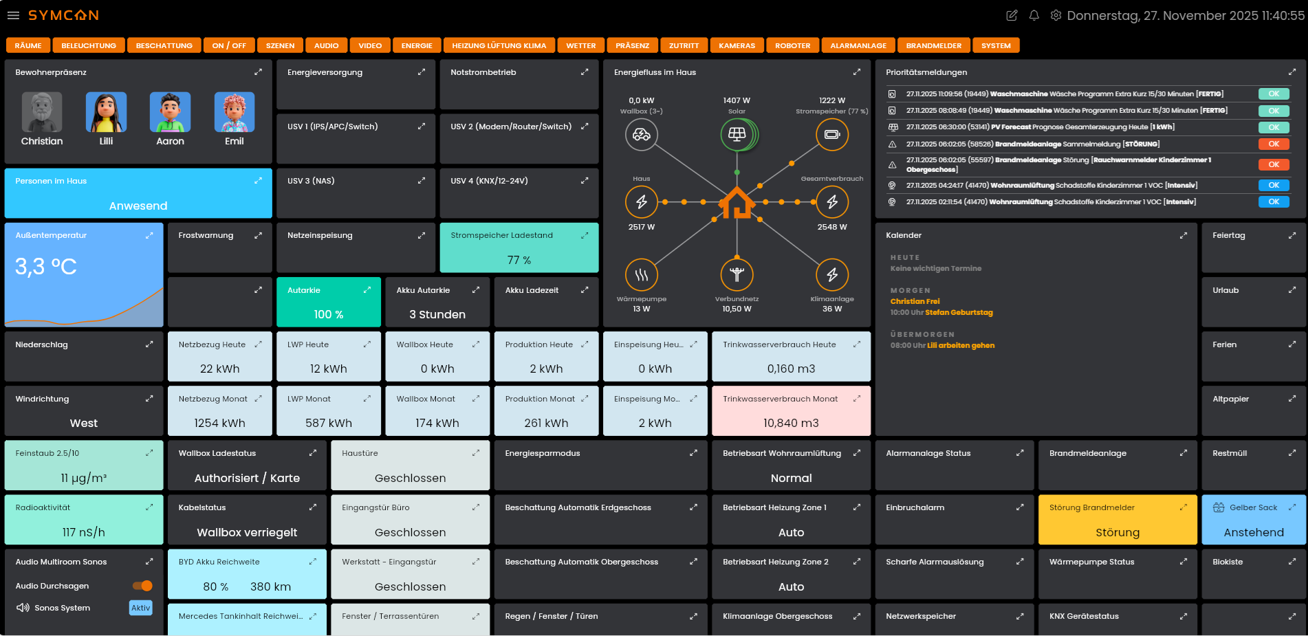 Hier sehe ich beispielsweise eine Ampel für die Luftqualität, das ich Blumen wässern muss und das Frostgefahr besteht. Es gibt aber noch viele andere im Moment ausgeblendete Widgets. Z.B. ob jemand etwas in den Briefkasten eingeworfen hat, ob die Müllabfuhr kommt usw. usw.